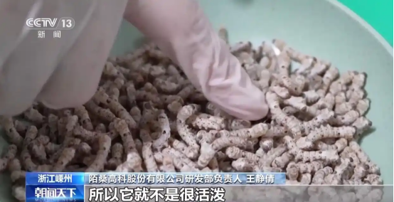 陌桑高科股份有限公司執(zhí)行總裁 何銳敏:我們用人工飼料替代桑葉,做到365天天天可以養(yǎng)蠶。一顆蠶繭的繭絲長(zhǎng)有1200米,外層跟內(nèi)層粗細(xì)基本相同,所以質(zhì)量是穩(wěn)定的。