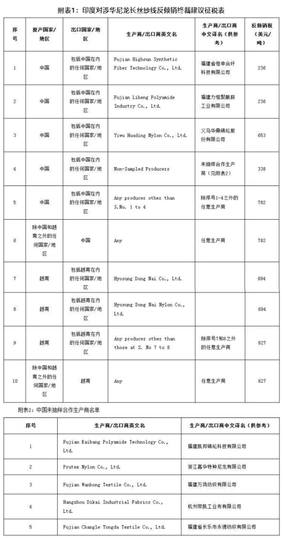 2026年3月19日,印度商工部發(fā)布公告,對原產(chǎn)于或進(jìn)口自中國和越南的尼龍長絲紗線(Nylon Filament Yarn)作出反傾銷肯定性終裁,建議對上述國家的涉案產(chǎn)品征收反傾銷稅,有效期為5年,征稅如下:中國為236-782美元/噸,越南為684-827美元/噸,征稅詳情見附表1和附表2。本案涉及印度海關(guān)編碼5402項下的產(chǎn)品。涉案產(chǎn)品不包括所有不含尼龍或聚酰胺的人造長絲紗線。以下產(chǎn)品被明確排除在涉案產(chǎn)品范圍之外:單絲紗線、散裝連續(xù)紗線、尼龍66紗線、熱熔紗線、低熔點紗、粘合紗、導(dǎo)電紗、抗靜電紗、諾梅克斯和芳綸紗、840旦及以上高強(qiáng)度紗。