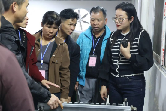 隨后,學(xué)員們先后前往小蠶共育室和大蠶房,深入生產(chǎn)一線觀摩學(xué)習(xí)。在小蠶共育室,大家認(rèn)真觀看小蠶共育生產(chǎn)線演示,詳細(xì)詢問(wèn)共育流程、溫濕度調(diào)控等關(guān)鍵技術(shù);在大蠶房,重點(diǎn)查看了自動(dòng)上簇架等省力化養(yǎng)蠶設(shè)備,了解其自動(dòng)上簇、便捷操作的優(yōu)勢(shì),直觀感受智能化設(shè)備對(duì)降低養(yǎng)蠶勞動(dòng)強(qiáng)度、提升養(yǎng)殖效益的重要作用。
