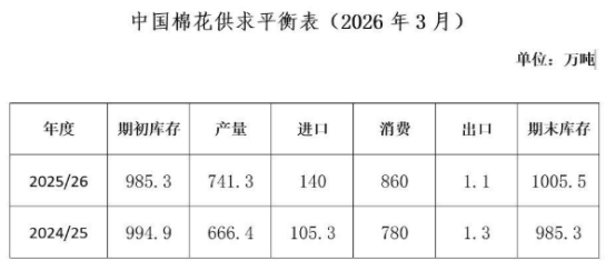 考慮到新疆紡紗產(chǎn)能持續(xù)擴(kuò)張成為國(guó)內(nèi)棉花消費(fèi)增長(zhǎng)的核心驅(qū)動(dòng)力,年初兩個(gè)月我國(guó)紡織品服裝出口明顯回暖,以及2月底中東沖突暴發(fā)推升原油價(jià)格飆升,化纖對(duì)棉花替代效應(yīng)階段性減弱,疊加傳統(tǒng)消費(fèi)旺季臨近,全年度棉花消費(fèi)呈現(xiàn)回升趨勢(shì),同時(shí),根據(jù)新棉加工檢驗(yàn)及新增配額情況,中國(guó)棉花協(xié)會(huì)調(diào)增了本年度棉花產(chǎn)量、進(jìn)口量和消費(fèi)量,預(yù)計(jì)2025/26年度全國(guó)棉花產(chǎn)量741.3萬(wàn)噸,同比增長(zhǎng)11.2%,較上期調(diào)增13.5萬(wàn)噸;進(jìn)口量140萬(wàn)噸,同比增長(zhǎng)33%,較上期調(diào)增30萬(wàn)噸;消費(fèi)量860萬(wàn)噸,同比增長(zhǎng)10.3%,較上期調(diào)增50萬(wàn)噸;出口1.1萬(wàn)噸,同比下降15.4%,較上期調(diào)減0.4萬(wàn)噸;期末庫(kù)存為1005.5萬(wàn)噸,同比增長(zhǎng)2.1%。