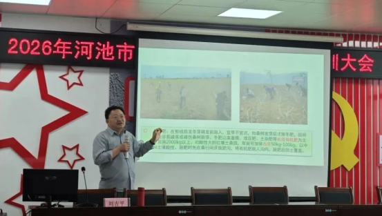 3月23日,團隊受邀參加國家蠶桑產(chǎn)業(yè)技術(shù)體系河池綜合試驗站春季桑蠶生產(chǎn)技術(shù)培訓大會,共有110名蠶農(nóng)參加培訓。培訓重點講解了春季桑園管護多個環(huán)節(jié)的關(guān)鍵技術(shù),并現(xiàn)場解答蠶農(nóng)在生產(chǎn)中遇到的實際問題。參訓蠶農(nóng)紛紛表示,授課內(nèi)容“聽得懂、學得會、用得上”,對解決日常生產(chǎn)難題幫助很大。培訓結(jié)束后,團隊在宜州區(qū)農(nóng)業(yè)農(nóng)村局干部陪同下深入桑園,手把手指導蠶農(nóng)解決田間病蟲害防治與桑園管護難題,助力提高當?shù)匦Q農(nóng)的種養(yǎng)水平及增產(chǎn)增收。