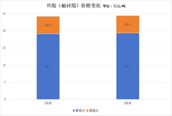 3月末絲綿(蛹襯綿)價格較2月末上行整體約2000元/噸左右,成為本月產(chǎn)業(yè)鏈中少數(shù)價格實現(xiàn)上行的品類。