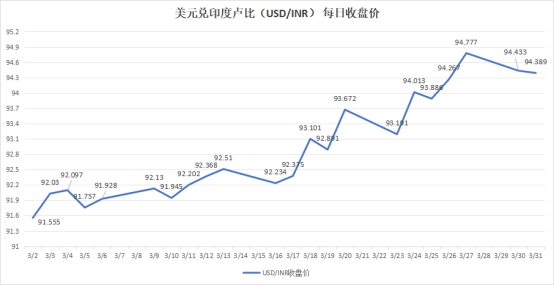 3月美元對印度盧比大幅升值,盧比呈現(xiàn)劇烈貶值走勢,約3.50%。3月中旬以來,受中東沖突推高油價、能源進(jìn)口成本攀升影響,盧比貶值加劇。3月30日,印度央行有經(jīng)濟(jì)救市行為。