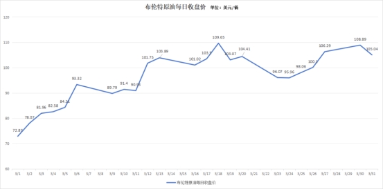 3月布倫特原油價格劇烈震蕩、大幅沖高后回落,整月仍上漲44.15%,中東地緣沖突主導(dǎo)行情。
