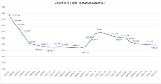 2026年3月,生絲電子指數(shù)在節(jié)后復(fù)工、地緣沖突擾動、內(nèi)外需分化、新繭季臨近等多重因素交織下,呈現(xiàn)先抑后揚(yáng)再震蕩、重心階段性下移、多空博弈加劇的核心運(yùn)行特征,全月指數(shù)圍繞4500點關(guān)口反復(fù)博弈,累計下跌2.15%,最終在新繭季開啟前維持弱勢整理格局收于4500點下方。