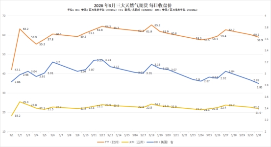 圖6:2026年3月三大天然氣期貨每日收盤價(數(shù)據(jù)來源:洲際交易所(歐洲)、紐約商業(yè)交易所、普氏能源資訊)