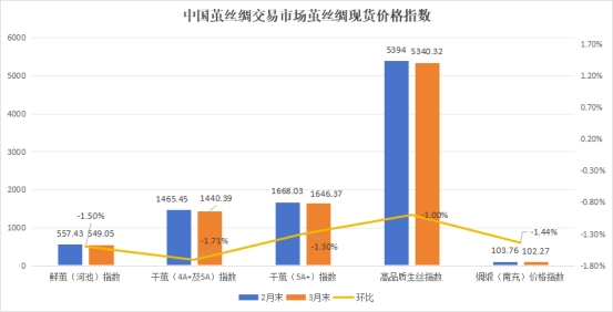 2026年3 月,繭絲綢產(chǎn)業(yè)鏈?zhǔn)苤袞|地緣沖突升級、原油及能源價格暴漲、匯率波動、新繭季提前上市及內(nèi)外需分化等多重核心因素交織影響,呈現(xiàn)電子盤面與現(xiàn)貨市場聯(lián)動承壓、現(xiàn)貨繭絲綢各品類指數(shù)環(huán)比下跌的核心運(yùn)行特征。