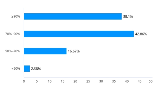 - 成本壓力普遍存在,賬期風(fēng)險需警惕:超六成企業(yè)成本小幅抬升(≤5%)。多數(shù)企業(yè)賬期集中在30-60天(52.38%),但60-90天賬期占比達(dá)30.95%,資金周轉(zhuǎn)壓力有顯現(xiàn)。