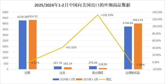 2026年1-2月我國絲綢商品出口額2.51億美元,同比增長15.39%,其中絲類出口量同比增長22.73%,真絲綢緞出口額同比增長27.88%,實現(xiàn)出口 “開門紅”。
