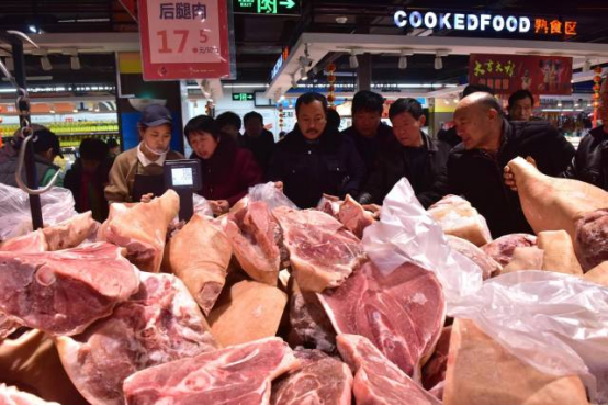 河北新樂市市民在當?shù)匾患页羞x購豬肉