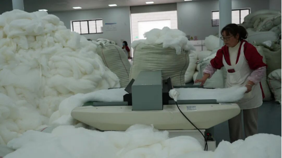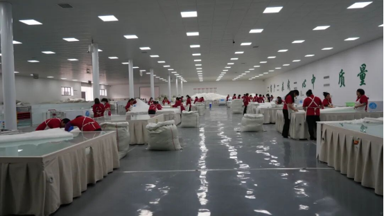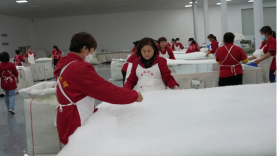 與順成絲綢一樣,銀海絲綢生產(chǎn)車間同樣一片繁忙,90余名工人全力趕制桑蠶絲被。作為“中國蠶絲被之鄉(xiāng)”核心企業(yè),其天然桑蠶絲被獲“天府名品”認證,近年通過升級車間、新增設備,產(chǎn)能大幅提升。公司辦公室主任彭偉介紹,公司一季度生產(chǎn)蠶絲被5萬多床,訂單與銷售額同比增5%,訂單已排至5月。