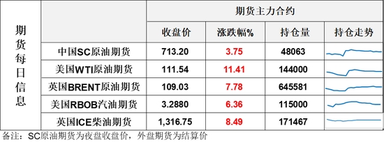 【1】WTI主力原油期貨收漲11.42美元,漲幅11.41%,報(bào)111.54美元/桶;布倫特主力原油期貨收漲7.87美元,漲幅7.78%,報(bào)109.03美元/桶;INE原油期貨收漲3.75%,報(bào)713.2元。