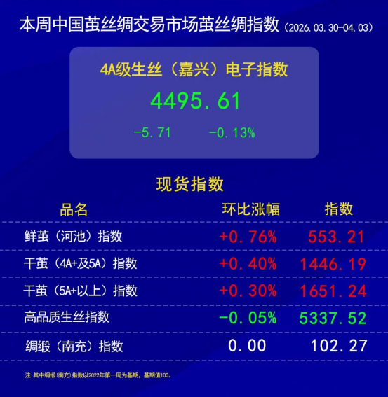今日(2026年04月03日,周五)中國繭絲綢交易市場生絲電子指數(shù)下跌0.14%報收于4495.61點,本周生絲指數(shù)累計下跌0.13%。B絲2022D(商檢4A級生絲):260425合約下跌0.15萬元報收于44.94萬元;260925合約下跌0.09萬元報收于44.88萬元;270325合約報平,收于44.94萬元。