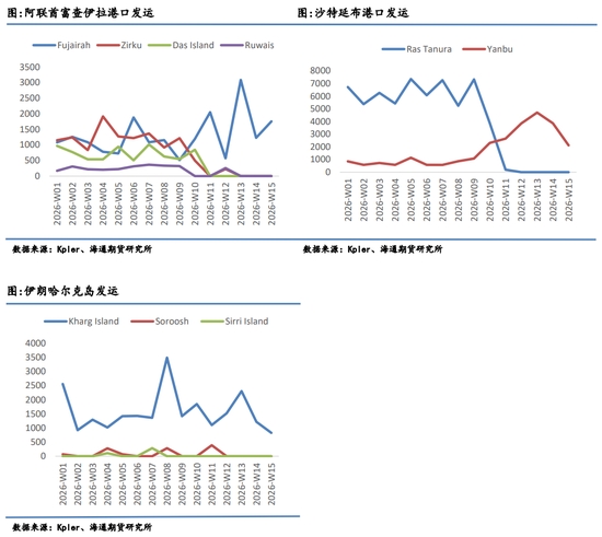 當前中東港口仍有伊朗哈爾克島、沙特延布港和阿聯(lián)酋富查伊拉港能夠較為順暢的進行石油發(fā)運。根據Kpler周度數據所示,沙特延布港平時維持至200-500萬桶/日周度日均發(fā)運水平,但因近期前往沙特延布港的油輪較多,港口較為堵塞整體發(fā)運水平略有下降。阿聯(lián)酋富查伊拉港雖未遭受堵塞的問題,但其最大的問題是頻繁遭受到伊朗革命衛(wèi)隊導彈襲擊,其發(fā)運量在100-300萬桶/日的體量并不穩(wěn)定。而伊朗哈爾克島并未受戰(zhàn)事影響,仍然平均可以達到周度日均發(fā)運100萬桶/日左右的量,后續(xù)若戰(zhàn)事升級,則三大可發(fā)運的港口都會有無法持續(xù)運行的可能性。阿聯(lián)酋富查伊拉可能遭受伊朗更猛烈地報復;沙特延布港可能會遭到胡塞武裝封鎖曼德海峽的影響;伊朗哈爾克島則會成為美國主要打擊的目標。整體發(fā)運情況還需繼續(xù)跟蹤地緣的發(fā)展。