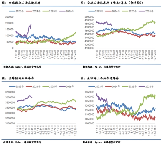 全球海上浮艙繼續(xù)上漲,超過7天停留時間的增長量近2000萬桶,通過浮艙明細來看,主要有中東油和伊朗油為主,浮艙在中東灣和黃海附近。中東灣內主要隨著海峽封鎖時間延長而變?yōu)楦∨?;伊朗油因允許通行影響而東行至黃海附近等待亞洲買家指令。全球陸地石油庫存繼續(xù)回落,近1周時間內在途回落了超3000萬桶,有一部分量級被浮艙所轉化。且中東陸地石油庫存因管道出口替代而減輕堆積程度。更為重要的是,沖突爆發(fā)以來的庫存消耗速度正加劇產業(yè)端的隱憂。全球海上在途庫存回落,主要受數據統(tǒng)計上浮艙增加,從而剔除在途范圍外,同時中東出口受阻,在途中東油量級大幅減少,所以導致在途庫存回落較快。俄羅斯在途庫存有所回落,來自印度的進口有助于其消化。