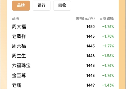 4月9日,品牌金價格整體小幅下跌約1.7%,周大福、老鳳祥、周生生等黃金克價均跌至1450元及以下,水貝金飾價跌至1200元附近,銀行投資金條克價跌至1060元左右。