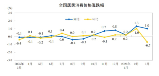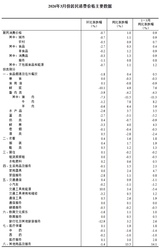 2026年3月份,全國居民消費價格同比上漲1.0%。其中,城市上漲1.1%,農(nóng)村上漲0.9%;食品價格上漲0.3%,非食品價格上漲1.2%;消費品價格上漲1.3%,服務(wù)價格上漲0.8%。1—3月平均,全國居民消費價格比上年同期上漲0.9%。