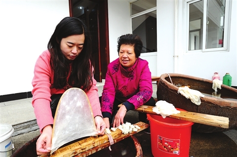沈福珍出生于桑蠶世家,祖父父親都是從事于絲經(jīng)生意,耳濡目染、勤學(xué)苦練了一手剝綿、翻制衣被的蠶絲加工技藝,在蠶桑專家費(fèi)達(dá)生先生的啟迪下,她研發(fā)了“潑濕煮繭法”,在煮繭環(huán)節(jié),使水的滲透度,繭子脫膠率,蠶絲的膨脹度、柔軟度達(dá)到最佳狀態(tài)。用“老蘇州”的話來(lái)說(shuō),絲綿脫膠做好了,蠶絲被不容易板結(jié),這樣做出來(lái)的蠶絲被,正常使用十年都不用重新翻制。
