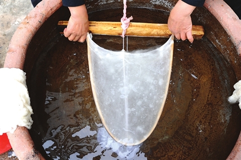 上好的太湖流域雙宮繭經(jīng)過(guò)脫膠,去蛹、剝綿(上繃脫繃)、晾曬、扯綿這些工序之后,就到了翻扯成胎這一步。傳統(tǒng)的翻扯成胎是以兩張方桌或板桌為工作臺(tái),兩人相對(duì)將綿條扯開(kāi),扯松攤平,橫豎層層疊加交叉,到邊到位使之復(fù)合至一定重量和一定幅寬、幅長(zhǎng),即做成絲綿被胎,這一道是最終工序,關(guān)鍵是兩人動(dòng)作協(xié)調(diào),用力平衡,剛中帶柔,拉住綿塊用力適度,慢慢放開(kāi),使蠶絲纖維像一層輕薄的絲網(wǎng)全面覆蓋。沈福珍在傳承父輩傳統(tǒng)工藝的過(guò)程中,經(jīng)過(guò)多年的實(shí)踐,將兩人拉扯改為四人拉制的蠶絲被拉制法。
