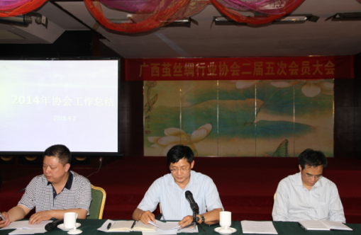 在會上,蘭會長首先回顧了2014年廣西絲綢行業(yè)整體運行情況,并指出行業(yè)在發(fā)展中存在的主要問題,總結了協(xié)會2014年的工作情況:一是堅持為企業(yè)搭建信息共享平臺,先后組織召開了三次會員大會,交流國內外生產(chǎn)市場信息,共同分析市場行情;二是成功舉辦第二屆廣西絲綢自主品牌精品展,擴大廣西絲綢品牌的影響力;三是開展繭絲綢企業(yè)生產(chǎn)統(tǒng)計工作,及時掌握我區(qū)絲綢行業(yè)生產(chǎn)運行動態(tài),為政府部門制定產(chǎn)業(yè)政策和發(fā)展規(guī)劃,促進行業(yè)有序發(fā)展提供依據(jù);四是積極推進廣西繅絲企業(yè)增值稅“高征抵扣”問題的解決。最后蘭會長還就2015年協(xié)會工作計劃做了說明:2015年將繼續(xù)發(fā)揮協(xié)會在政府和企業(yè)之間的橋梁紐帶作用,為企業(yè)做好生產(chǎn)經(jīng)營搭建信息交流平臺。繼續(xù)推進我區(qū)絲綢自主品牌建設工作,做好廣西“十三五”繭絲綢行業(yè)發(fā)展規(guī)劃的研究編制任務,著手準備協(xié)會換屆選舉工作,努力加強協(xié)會組織建設,完善工作機制,提升服務水平,提高協(xié)會凝聚力,積極為會員提供服務。