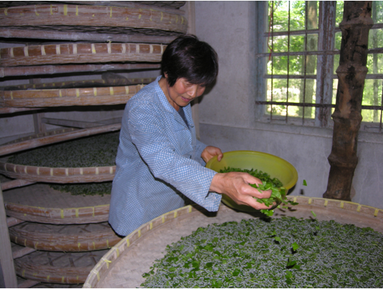 圖為王店鎮(zhèn)國慶村養(yǎng)蠶示范戶李付林正在給將眠的2齡蠶添葉喂食