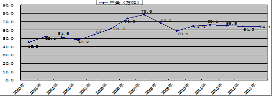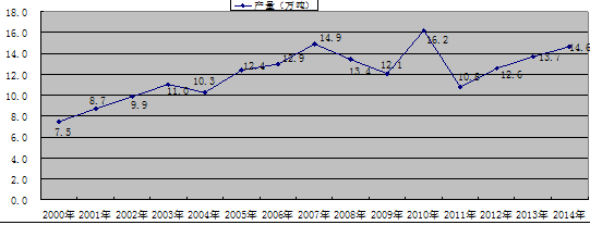 從2000-2014年全國蠶繭產(chǎn)量情況看:雖然近三年略有下滑,但基本維持在64萬噸左右(見圖一)。