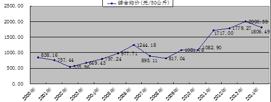 圖三 2000-2014年全國蠶繭收購均價情況(單位:元/擔(dān))