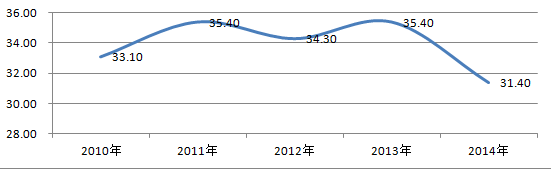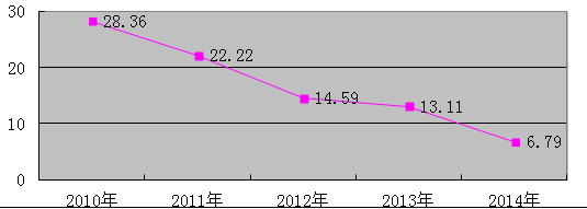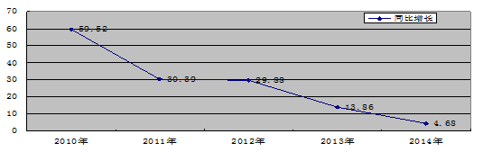 2、工業(yè)經(jīng)濟穩(wěn)步增長 據(jù)國家統(tǒng)計局統(tǒng)計,2014年全行業(yè)規(guī)模以上企業(yè)主營業(yè)務(wù)收入1281.29億元,同比2013年增長6.79%,同比2010年下降33.6%;利潤69.58億元,同比2013年增長4.68%,同比2010年下降9.02%;這里需要說明的是:由于國家統(tǒng)計局自2011年起上調(diào)規(guī)模以上企業(yè)主營業(yè)務(wù)起點標(biāo)準(zhǔn),使得納入統(tǒng)計的企業(yè)數(shù)量減少,造成主營業(yè)務(wù)和行業(yè)利潤總額減少,但2011-2014年均實現(xiàn)了正增長。由于2014年主營業(yè)務(wù)和利潤增速分別較2010年底回落21.57和54.84個百分點(見圖五、圖六),可見行業(yè)經(jīng)濟增速在逐年放緩,其下行的風(fēng)險和壓力仍在不斷加大。 圖五 2010-2014年絲綢行業(yè)主營業(yè)務(wù)增速情況(同比%)