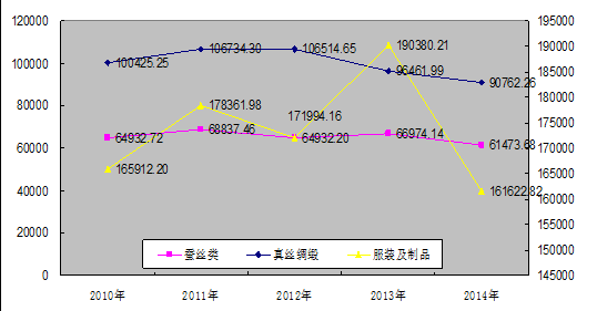 (三)外貿(mào)出口下滑 據(jù)中國海關(guān)統(tǒng)計,2014年全國真絲綢商品出口31.38億美元,同比2010年下降8.32%。其中,絲類產(chǎn)品出口金額6.15億美元,同比2010年下降5.33%;真絲綢緞出口金額9.08億美元,同比2010年下降9.62%;絲綢服裝及制品出口16.16億美元,同比2010年下降2.59%。從圖七可以看出,2014年全行業(yè)出口金額已經(jīng)創(chuàng)近四年來的新低,出口形勢更趨嚴(yán)峻。 圖七2010-2014年真絲綢商品出口金額走勢圖(單位:億美元) 圖八 2010-2014年真絲綢主要商品出口金額走勢情況