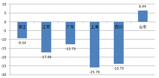 從主要省市出口情況看,浙江、江蘇、廣東、上海、四川等省市真絲綢商品出口金額較2010年均出現(xiàn)了不同程度的下降,下降幅度分別為9.34%、17.36%、12.73%、25.79%、23.75%,上海和四川降幅較大,僅有山東實現(xiàn)了6.44%的增長(見圖九)。