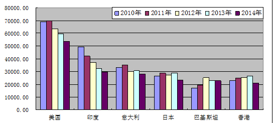 從對主銷市場出口情況看:2010-2014年國內(nèi)真絲綢商品對傳統(tǒng)主銷市場出口金額整體下滑,對美國、印度、意大利、日本、香港出口金額較2010年下降幅度分別為22.1%、40.07%、15.6%、12.34%、8.61%,僅有巴基斯坦同比增長34.6%。其中,對美出口三連降,對印度市場出口已經(jīng)連續(xù)四年下降,且平均降幅超過10%(見圖十)。 圖十 2010-2014年真絲綢商品對主銷市場出口金額情況(金額:萬美元)