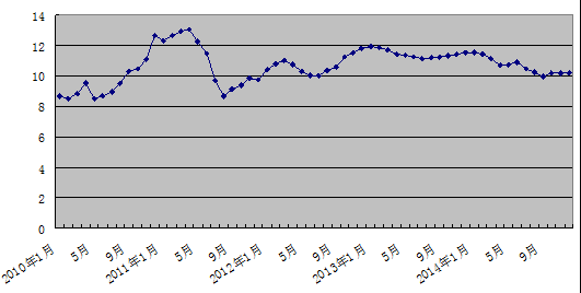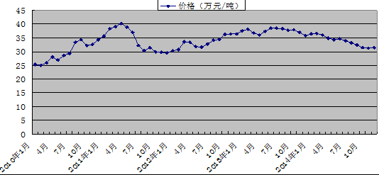 圖十二 2010-2014年生絲價格走勢圖(價格:萬元/噸)