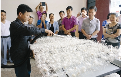 本次新型取繭技術現(xiàn)場觀摩演示會,對進一步改進摘繭機的技術性能、降低成本、提高效率有積極的促進作用,廣大蠶農(nóng)將從中受益。圖為觀摩會現(xiàn)場。