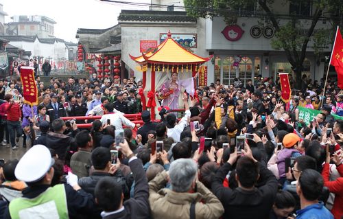 縱橫交錯的河網(wǎng)沉淀著1700多年蠶桑文化的德清新市,1999年,恢復(fù)蠶花廟會的傳統(tǒng)習(xí)俗,17年來持續(xù)舉辦蠶花廟會。今年4月3日至4月6日,新市一年一度的蠶花廟會如期而至。4月3日開幕式當(dāng)天,軋蠶花、蠶花娘娘花轎巡游、祭蠶神等豐富多彩的民俗活動,吸引了上萬游客慕名而來,古鎮(zhèn)被擠得水泄不通。
