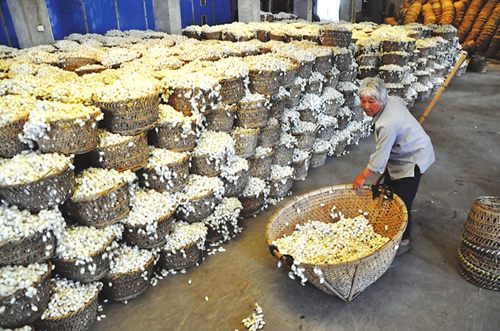 梅堰欣農繭站是平望鎮(zhèn)僅存的一個繭站,在上世紀八九十年代曾獲得過不少榮譽,被人們稱為“榮譽繭站”,然而這個紅極一時的繭站在現(xiàn)代化的進程中卻面臨生存的困境——收蠶量逐年下降。繭站的工作人員宋火生告訴記者,在上世紀八九十年代,吳江一帶的農村幾乎家家戶戶種桑養(yǎng)蠶,靠養(yǎng)蠶發(fā)家致富。光平望就有7個繭站,每個繭站都能收到2000多擔(每擔相當于100斤)以上,每當蠶繭豐收時,每個繭站都要用五六臺秤收繭,每臺秤前都要排幾公里的長隊,收的繭子放不下,還堆放到鎮(zhèn)里能容納1000多人的電影院里,現(xiàn)在盡管只剩下他們一家繭站了,每年卻只收到500擔不到的繭子。