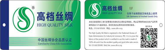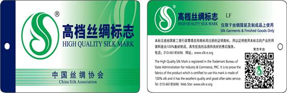 備注:最新版標(biāo)簽已將舊版 “中國(guó)絲綢協(xié)會(huì)品質(zhì)認(rèn)證” 中的“品質(zhì)認(rèn)證”四字予以刪除,并將標(biāo)簽正反面中的“高檔絲綢”改為“高檔絲綢標(biāo)志”。