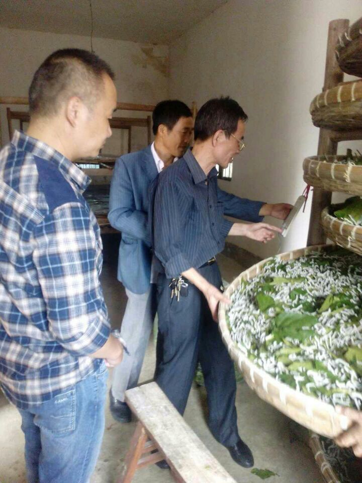 圖為技術(shù)人員正在新塍鎮(zhèn)富園村養(yǎng)蠶戶家中進(jìn)行指導(dǎo)