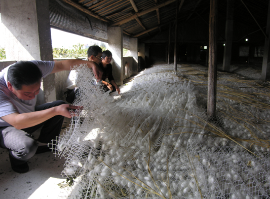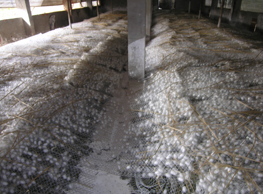 圖為王店鎮(zhèn)保華村桑園雞大戶金惠忠7張飼養(yǎng)在雞棚內(nèi)的晚秋蠶的繭子。