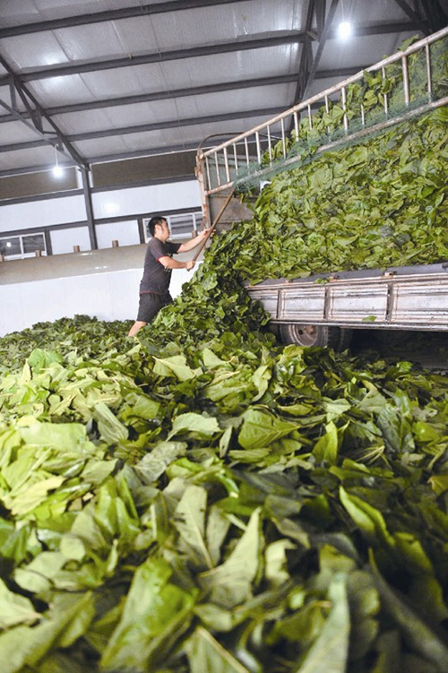 10月9日,南充市一家桑葉茶生產(chǎn)企業(yè)正在裝卸新鮮桑葉,同時用制茶機器對桑葉進行清洗、切碎、殺青、揉捻、定型、烘干等程序加工桑葉茶。