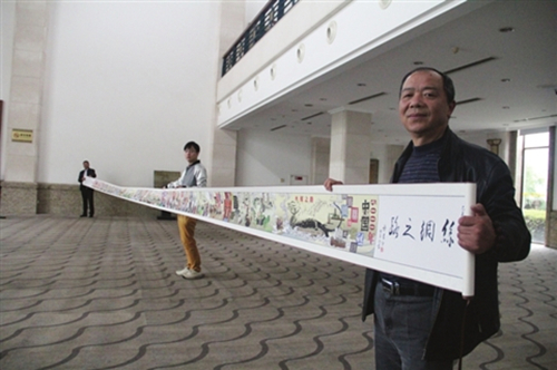 一幅蘇州原創(chuàng)的14.6米《絲綢之路》彩繪長(zhǎng)卷于前天首次亮相。這是首件以長(zhǎng)卷形式全景再現(xiàn)我國(guó)5000年絲綢文化的作品,涉及相關(guān)人物、事件、書(shū)籍190多位(件、本),其中一成與“絲綢之府”蘇州有關(guān)。