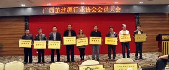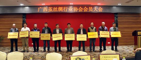 大會(huì)選舉廣西絲綢(集團(tuán))有限公司總經(jīng)理蘭樹思擔(dān)任協(xié)會(huì)第三屆理事會(huì)會(huì)長(zhǎng),廣西桂合集團(tuán)有限公司、廣西蠶業(yè)技術(shù)推廣總站、廣西宜州市宏基繭絲有限公司等11家單位擔(dān)任副會(huì)長(zhǎng);橫縣桂華繭絲綢有限責(zé)任公司、廣西大宗繭絲交易市場(chǎng)有限公司、廣西宜州茂源繭絲有限公司等11家單位擔(dān)任常務(wù)理事;廣西江緣繭絲綢有限公司、鹿寨貴盛繭絲工貿(mào)有限公司、廣西立盛繭絲綢有限公司等11家單位擔(dān)任理事。選舉覃鋼同志為協(xié)會(huì)第三屆理事會(huì)秘書長(zhǎng)。