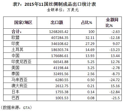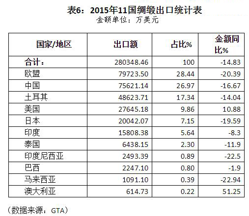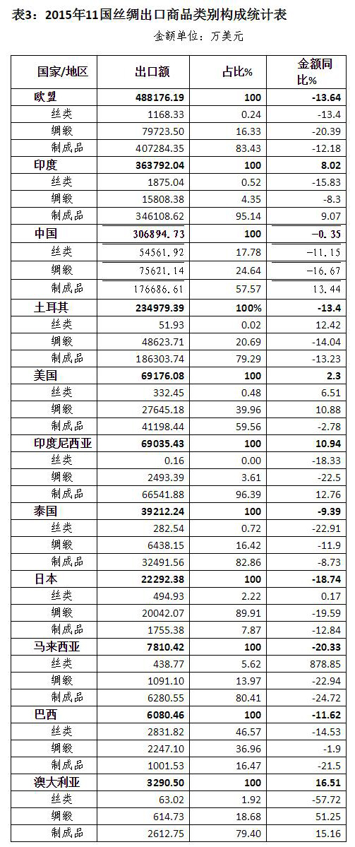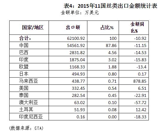 1、金額:2015年11國(guó)絲類出口金額為6.21億美元,同比下降10.92%。中國(guó)、巴西、印度和歐盟分別出口了5.45億美元、2831萬美元、1875萬美元和1168萬美元,合計(jì)出口為6.04億美元,占比達(dá)97.32%。這4個(gè)主要出口者出口同步下降,降幅均超過10%。各主要出口者的市場(chǎng)份額變化不大,中國(guó)仍是市場(chǎng)絕對(duì)的主要供應(yīng)者,所占份額為87.86%,同比微降0.23個(gè)百分點(diǎn)(詳見表4)。