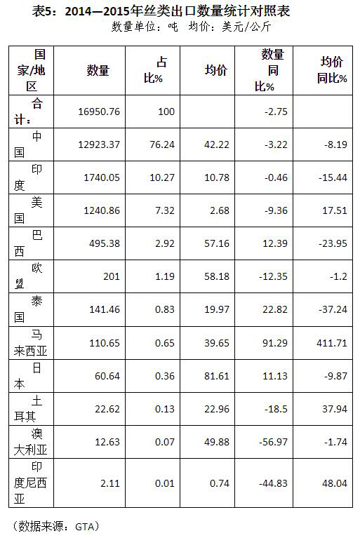 4、 歐盟、日本、印度和中國(guó)作為絲類主要市場(chǎng),所需絲類質(zhì)量和檔次明顯不同,2015年進(jìn)口均價(jià)同步下降,說明絲類行情是整體下行;