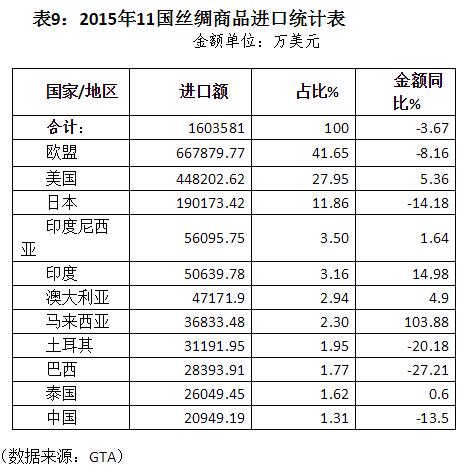 1、金額:2015年,11國(guó)絲類進(jìn)口額為4.95億美元,同比下降13.68%。歐盟、印度和日本是傳統(tǒng)進(jìn)口方,進(jìn)口額雖下降,但合計(jì)金額仍達(dá)4.57億美元,占比也高達(dá)92.33%,與2014年基本相當(dāng)。其余市場(chǎng)進(jìn)口大部分下降,只有美國(guó)和馬來西亞增長(zhǎng),因基數(shù)太小,其增長(zhǎng)尚不能影響整個(gè)消費(fèi)市場(chǎng)格局變化(詳見表11)。