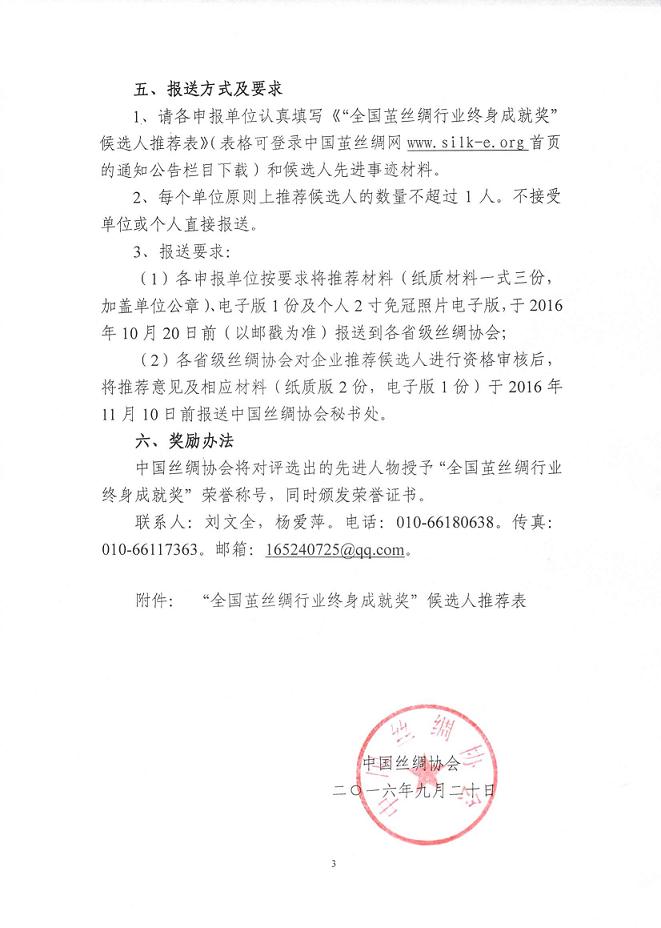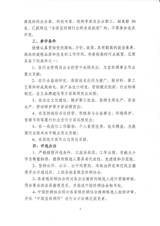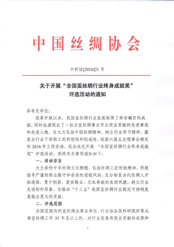 中國絲綢協(xié)會關(guān)于開展“全國繭絲綢行業(yè)終身成就獎”評選活動的通知