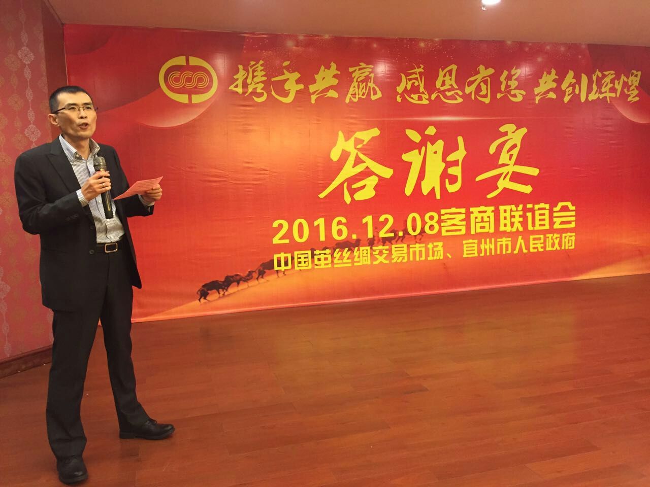 中國繭絲綢交易市場劉卓明總經(jīng)理發(fā)表熱情洋溢的答謝詞。劉總說,今天上午,我們參觀了宜州的四家企業(yè),感慨萬分,廣西繅絲企業(yè)的規(guī)模奠定了中國絲綢在國際上的地位,引領(lǐng)了中國繅絲的創(chuàng)新發(fā)展。 下午,我們真誠的交流,共敘未來。隨著東桑西移專業(yè)化發(fā)展的趨勢 不斷加快,我們深刻地認(rèn)識(shí)到,在新的時(shí)代里,我們面臨的是機(jī)遇也是挑戰(zhàn),要不斷的調(diào)整思路,與時(shí)俱進(jìn),加大上下游的融合,相互理解,攜手共進(jìn)。就在一個(gè)月前,作為中國繭絲綢交易市場控股股東--嘉欣絲綢深度融入中西部繭絲綢行業(yè)的重要戰(zhàn)略部署,宜州這塊絲綢的風(fēng)水寶地迎來了嘉欣宜州絲綢園項(xiàng)目的正式簽約,這意味著: 嘉欣絲綢將與宜州絲綢人一起,努力拼搏,把宜州培育成為中國絲綢集散中心,新的中國絲綢交易中心,為實(shí)現(xiàn)宜州市委市政府提出的把宜州建設(shè)成為“中國絲綢新都”的目標(biāo)而努力。