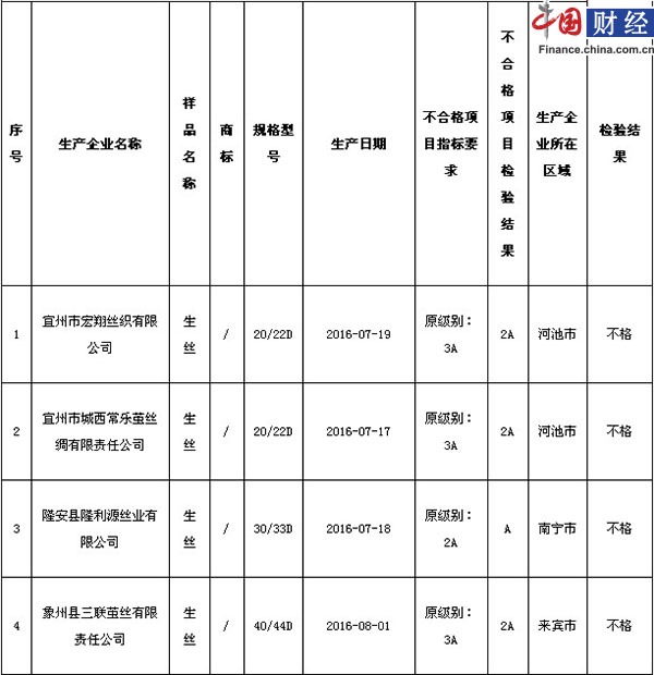 本次主要以《2016年生絲產(chǎn)品質(zhì)量廣西監(jiān)督抽查實(shí)施細(xì)則》為檢驗(yàn)依據(jù)。經(jīng)檢驗(yàn),宜州市宏翔絲織有限公司、宜州市城西常樂(lè)繭絲綢有限責(zé)任公司、隆安縣隆利源絲業(yè)有限公司、象州縣三聯(lián)繭絲有限責(zé)任公司等4家企業(yè)的4批次樣品不合格,涉及級(jí)別1個(gè)項(xiàng)目。
