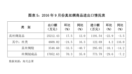進(jìn)出口情況 :據(jù)海關(guān)總署數(shù)據(jù),1-9 月份,我國(guó)真絲綢商品出口額 18.58 億美元,同比下降 9.9%;進(jìn)口額 1.5 億美元,同比下降 2.6%。其中,9 月份我國(guó)真絲綢商品出口額 2.52 億美元,環(huán)比、同比分別上升 17.5%、12%;進(jìn)口額 0.12 億美元,環(huán)比、同比分別下降 22.9%、3.5%。