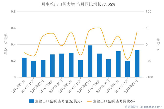 據(jù)前瞻數(shù)據(jù)庫數(shù)據(jù)顯示,2017年1月我國生絲出口金額為0.33億美元,當月同比增長37.05%。