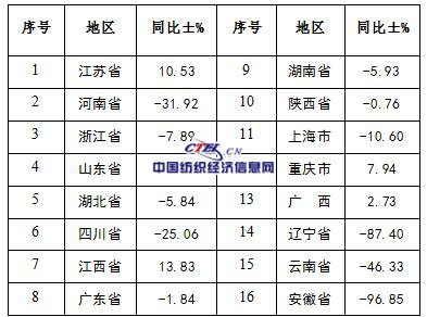 2016年1-12月各省市蠶絲被產(chǎn)量表
